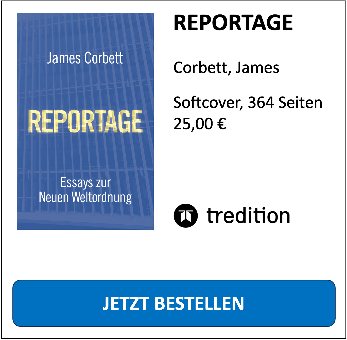 Jetzt überall im Handel: die deutsche Ausgabe von "Reportage - Essays zur Neuen Weltordnung", dem ersten Buch von James Corbett. Softcover, 364 Seiten, exklusiv über regenauer.press.