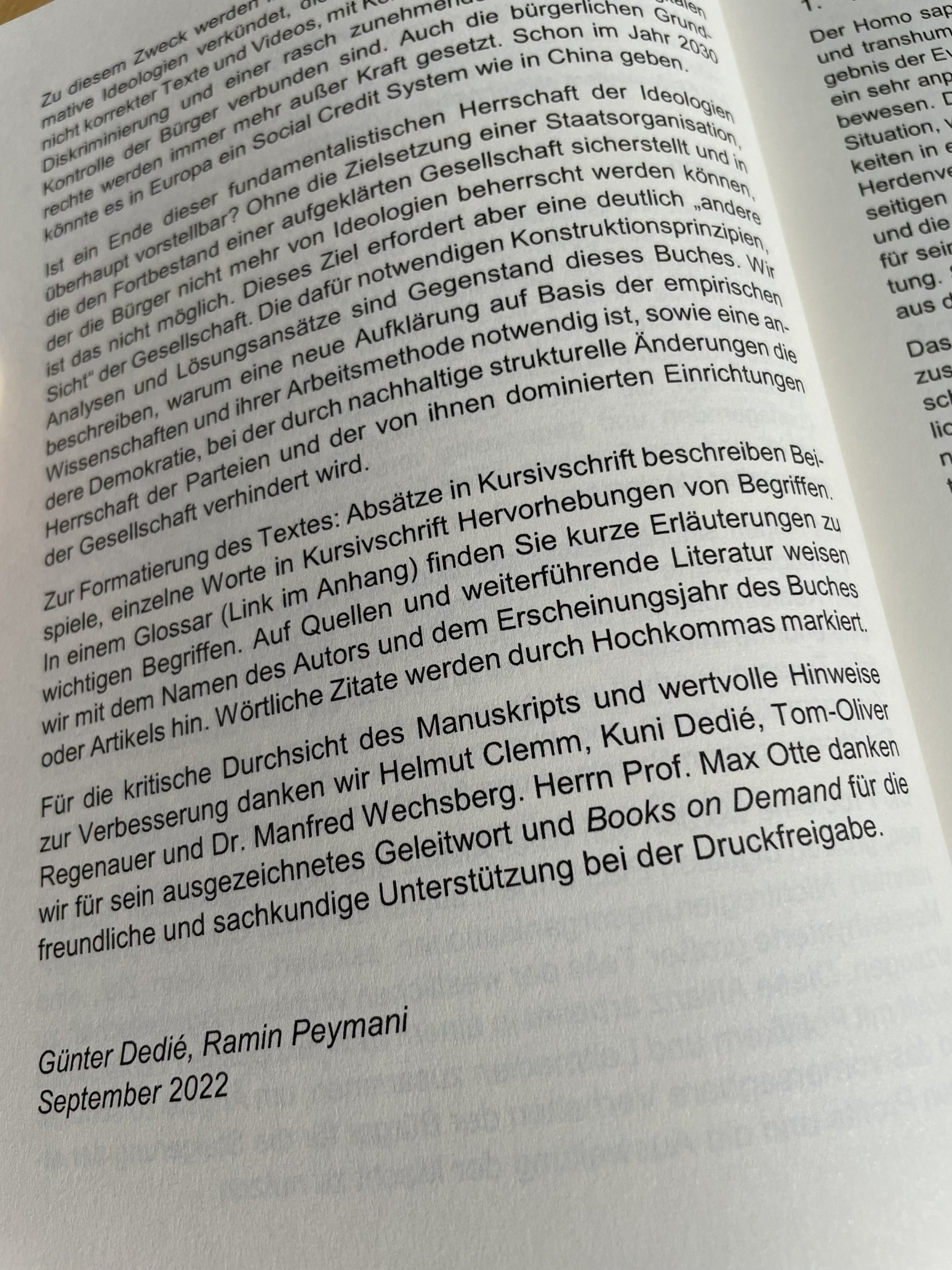 Inspiriert von meinem Text »Spaziergang ins Ungewisse«, der im Januar 2022 veröffentlicht wurde, haben die Autoren Günter Dedié und Ramin Peymani ein Buchprojekt aufgesetzt. Im Verlauf des Jahres kam mir die Ehre zuteil, die Entstehungsphase des Werkes beratend begleiten zu dürfen. Nun freue ich mich über die Danksagung im Prolog des jüngst erschienen Werkes – und möchte interessierten Lesern hier einen kurzen Überblick zum Inhalt des Buches auf der Basis eines Textes von Günter Dedié bieten.